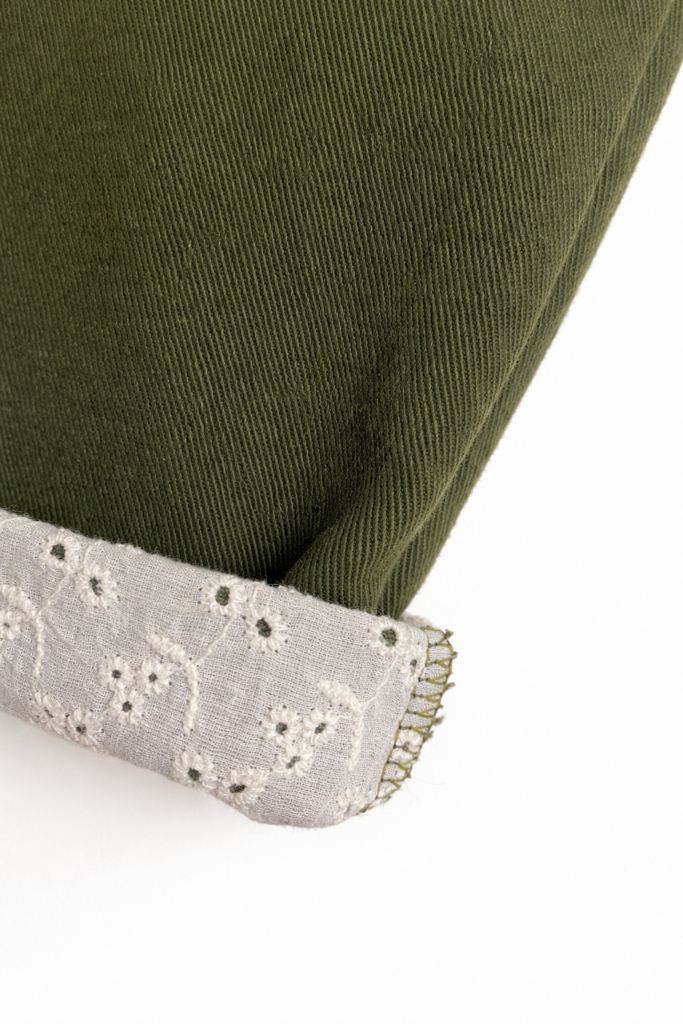 Dettagli ricercati: Caratterizzato da una vita elasticizzata con coulisse regolabile, tasche laterali funzionali e un distintivo risvolto in pizzo sulla gamba.